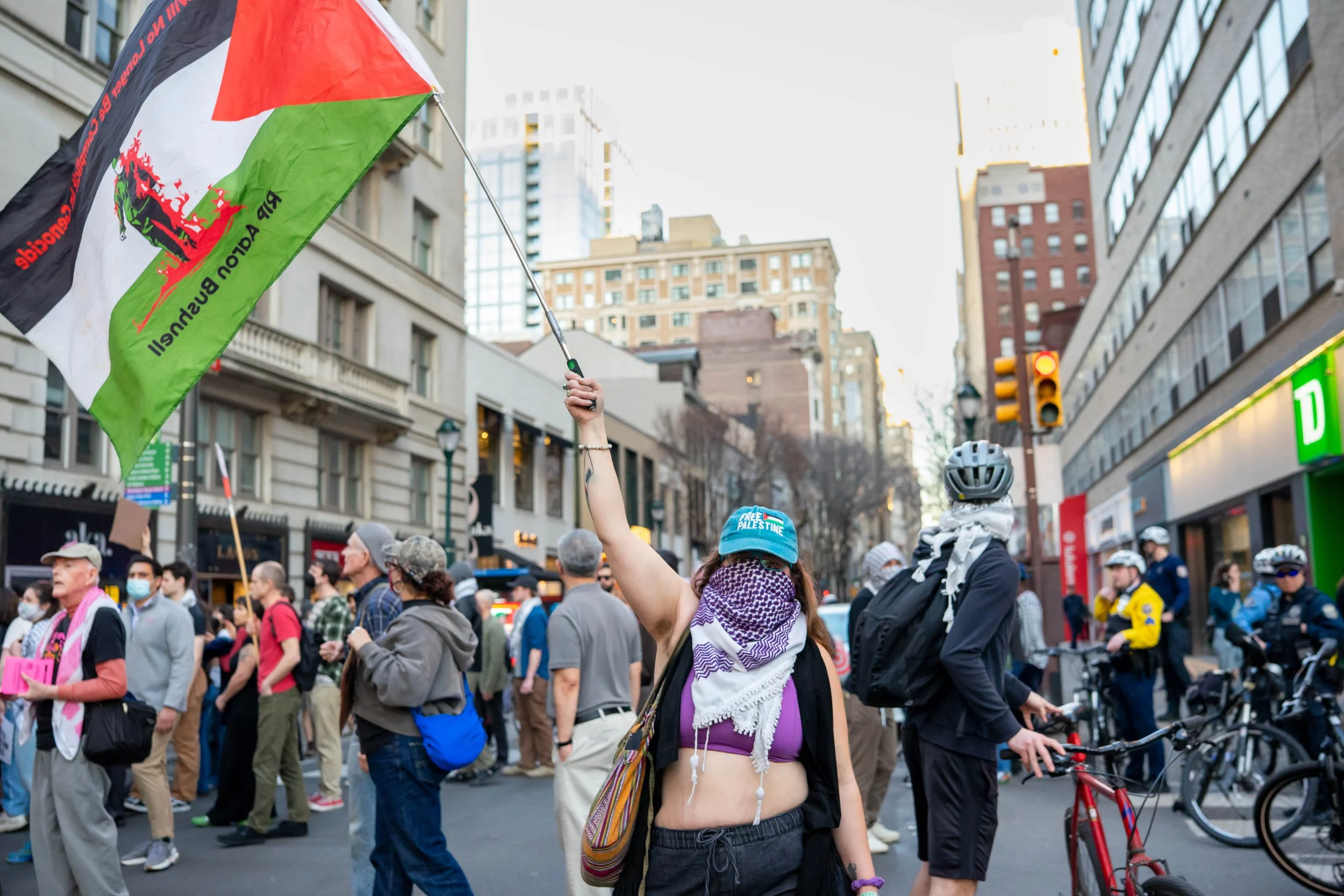 A protester waves an “RIP Aaron Busnell” flag. Bushnell, a member of the U.S. Air Force, set himself on fire in front of the Israeli embassy in Washington D.C. in 2024 to protest the genocide in Gaza.