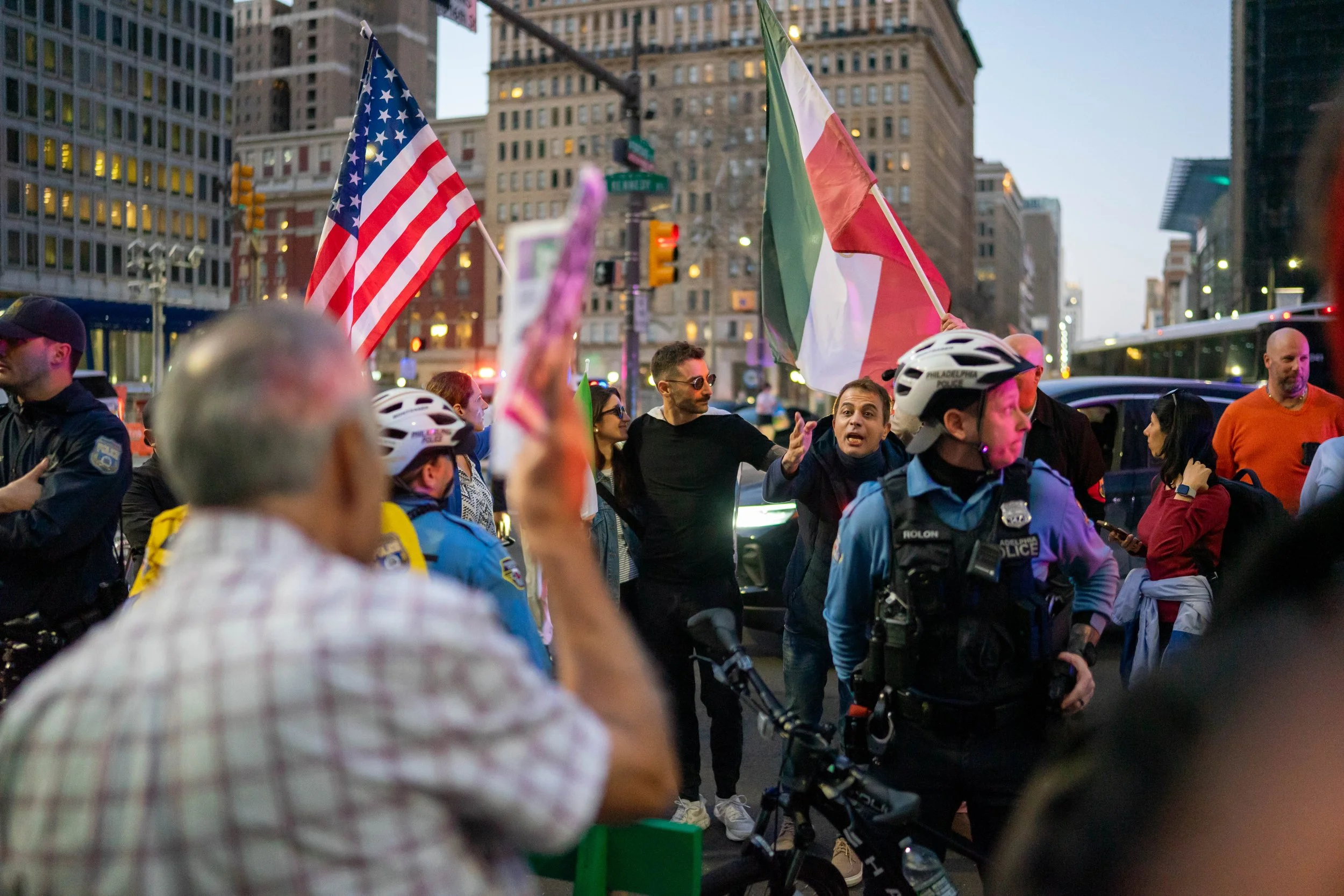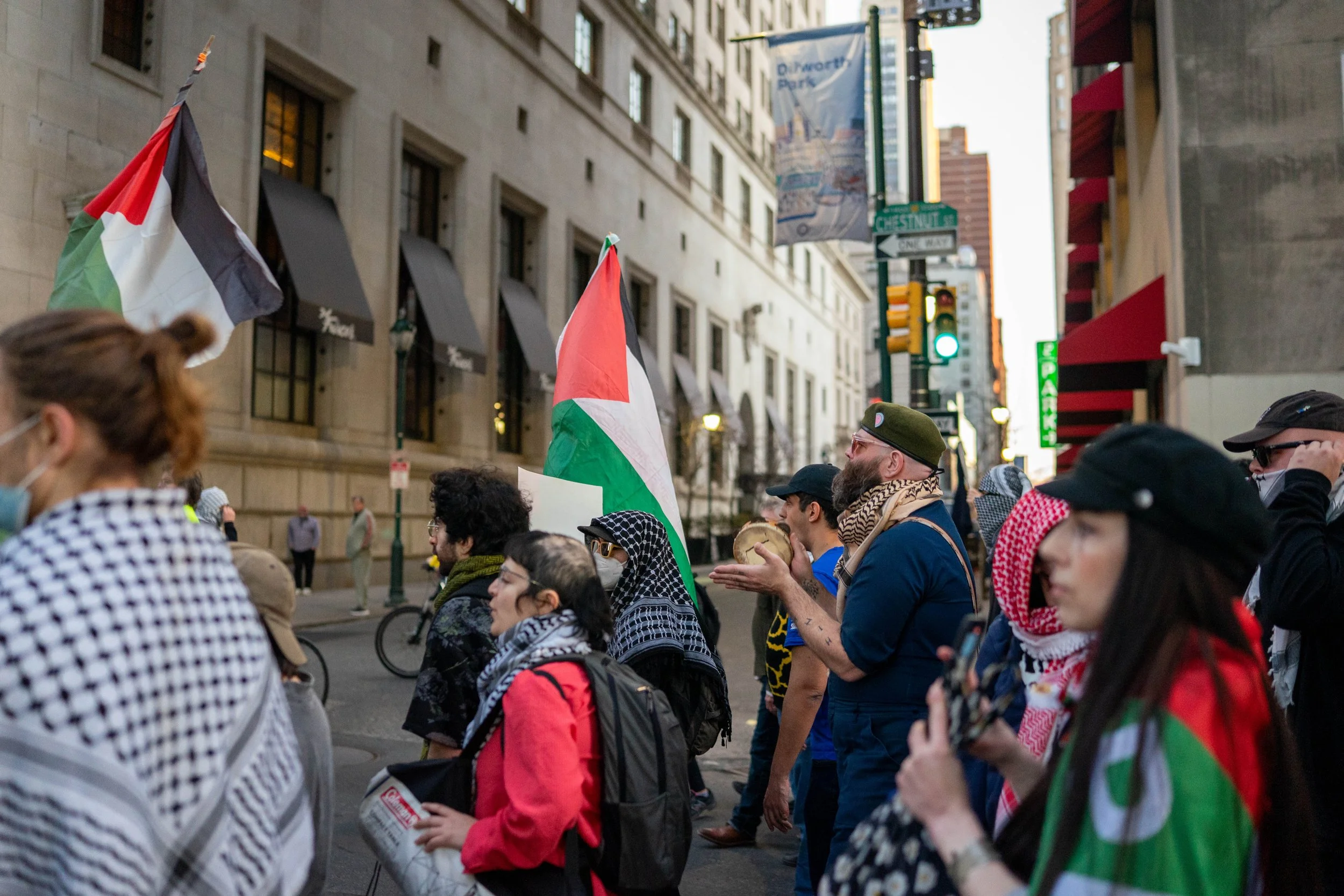 Hundreds of protesters gathered in Rittenhouse Square Park on Monday evening to march against the joint U.S.–Israel military attacks on Iran. The protest was organized by the Philly Palestine Coalition and was met by a group of counter–protestors, including Iranians, in support of the military actions against Iran.